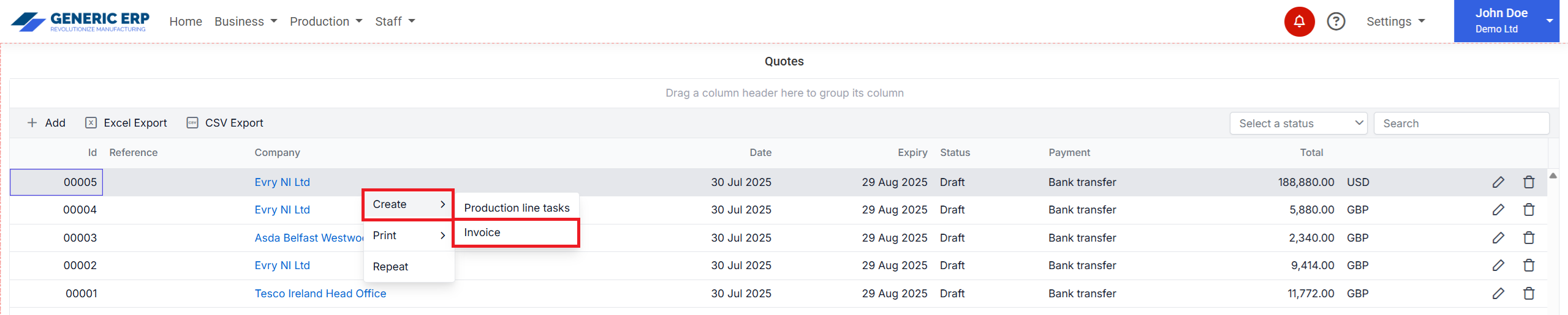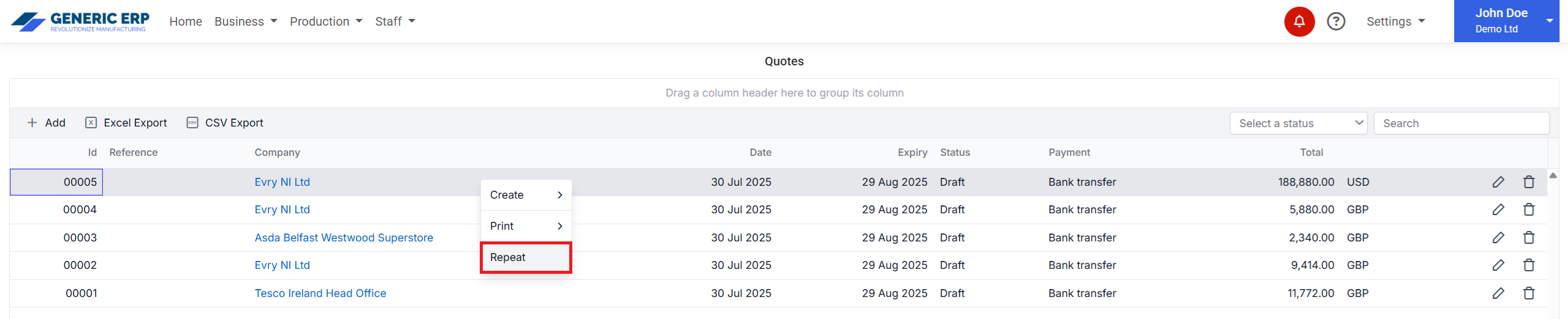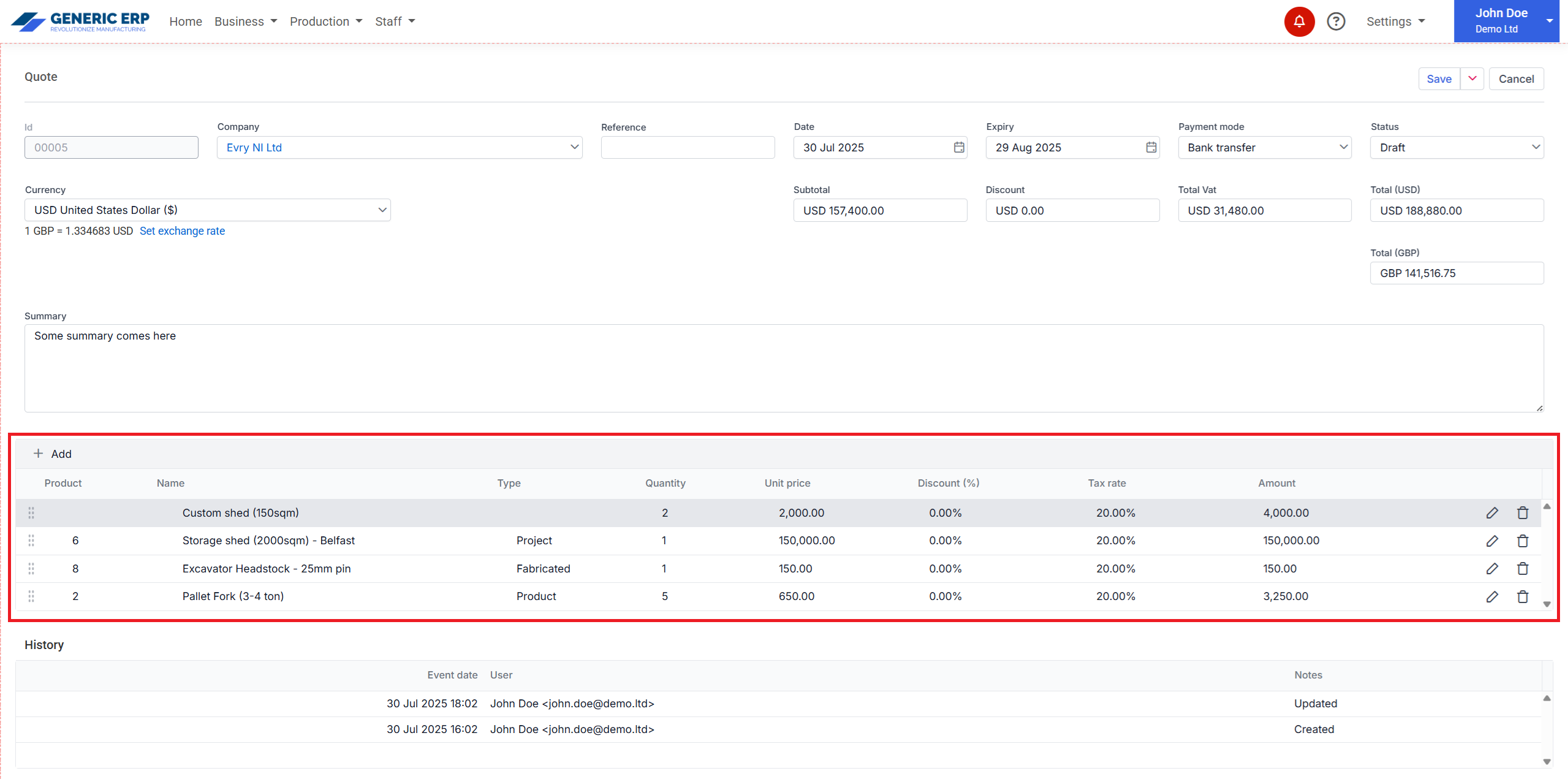 Quote allows to use predefined Customers or custom can be entered in the editor page, that will be inserted into Contact section and can be reused for other documents like Invoice, Purchase orders, etc.