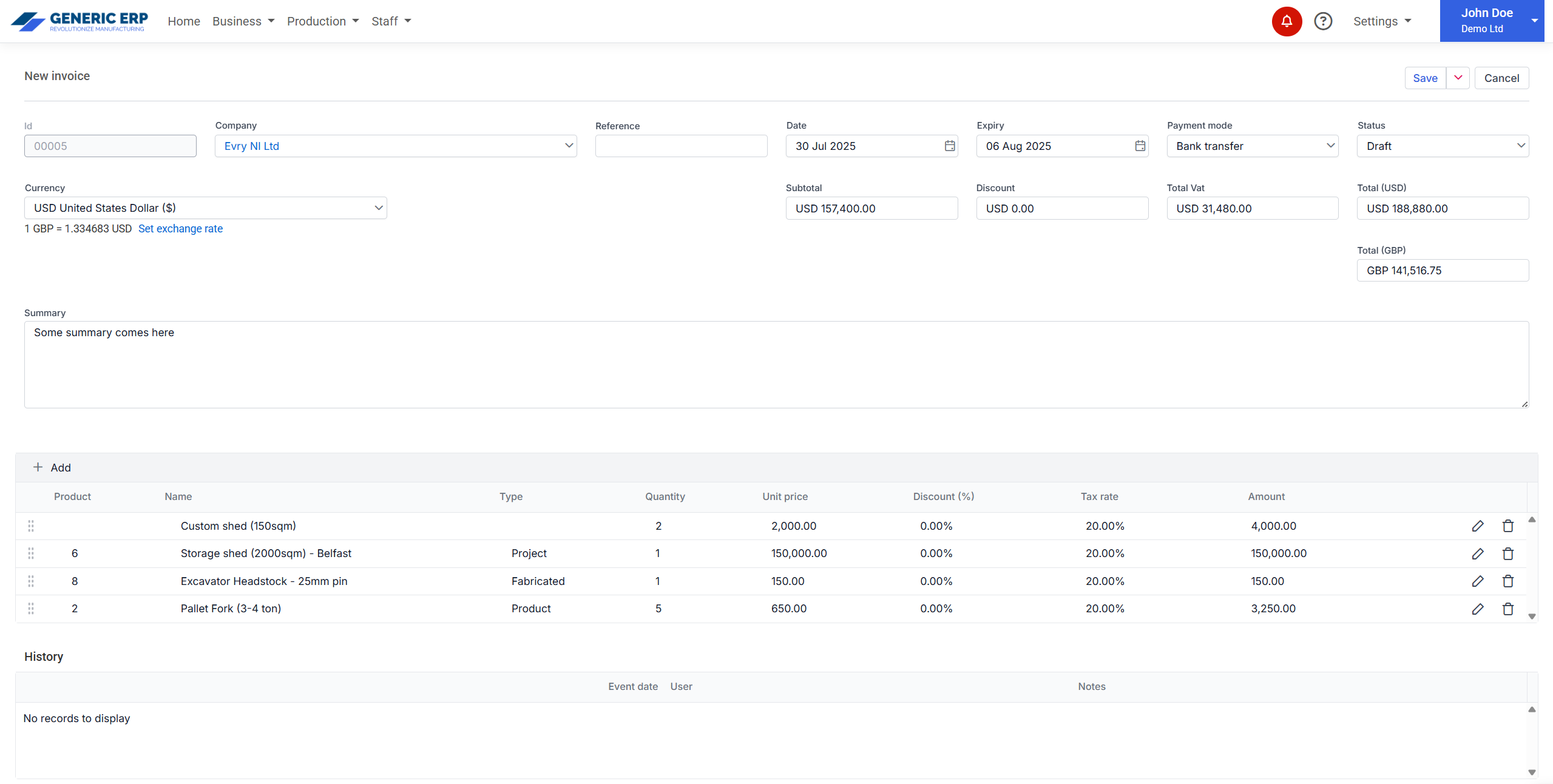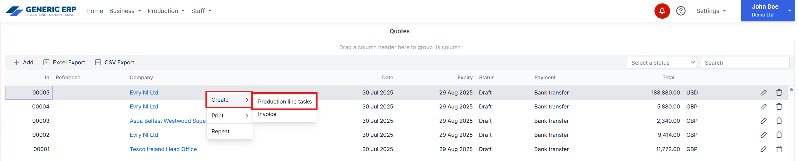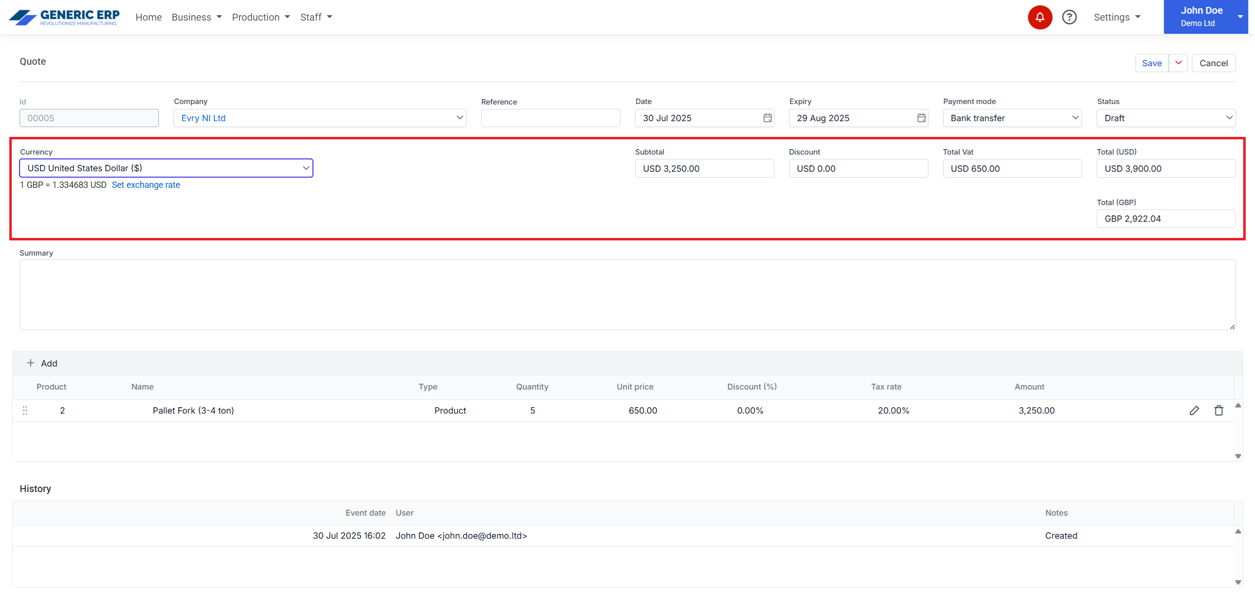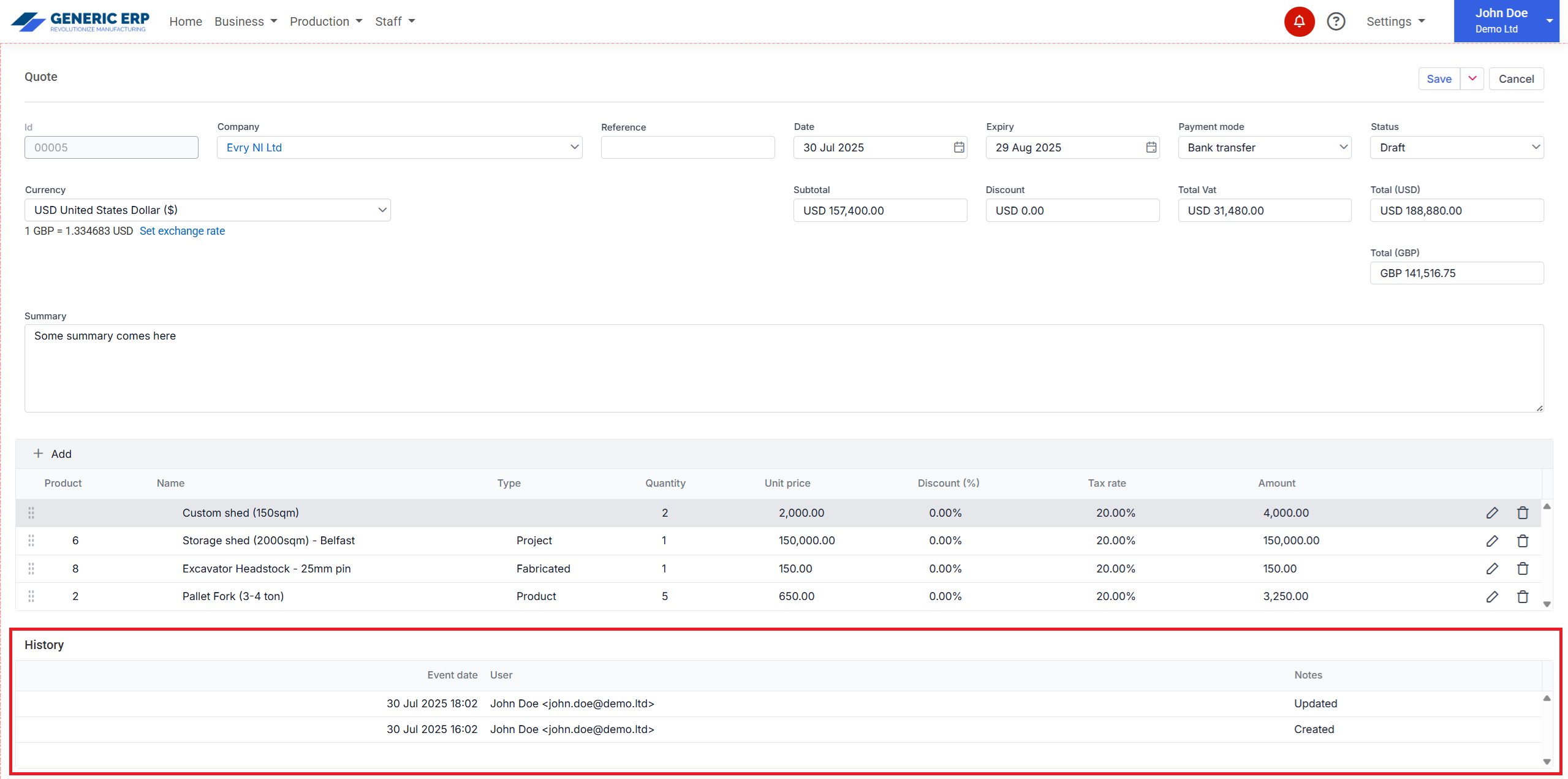 Quote allows to use predefined Customers or custom can be entered in the editor page, that will be inserted into Contact section and can be reused for other documents like Invoice, Purchase orders, etc.