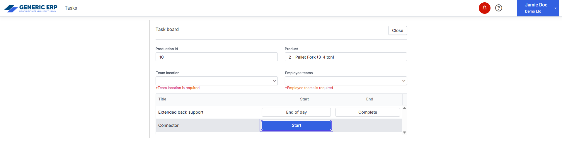 Before task is started, Location and Team must be selected.